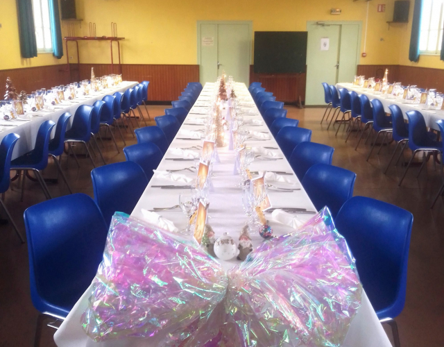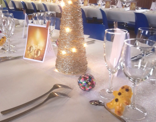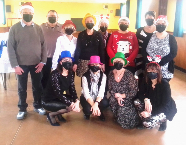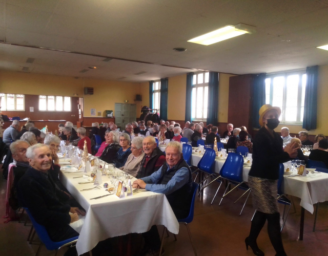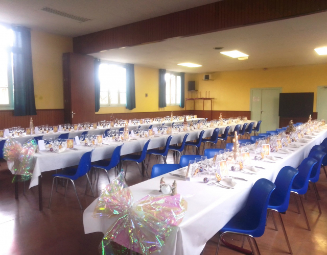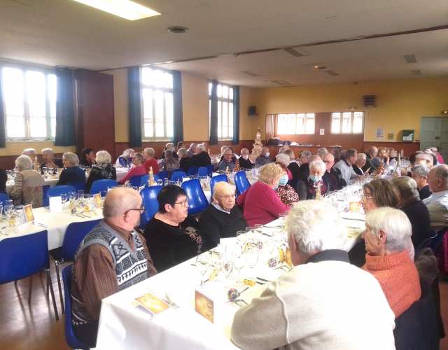 Nous avons accueilli 80 convives tous heureux de se retrouver autour d’un bon repas concocté par les établissements Duby de Feillens. Cette année la salle a été décoré sur le thème noël festif et paillettes. Les serveurs ont égayé cette belle journée en portant le chapeau pailleté ou le bonnet traditionnel de noël. L’ambiance, la bonne humeur et la convivialité étaient les clés de cette journée très réussie.